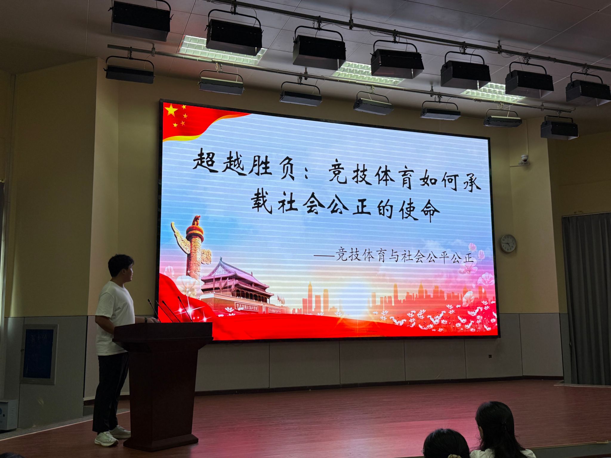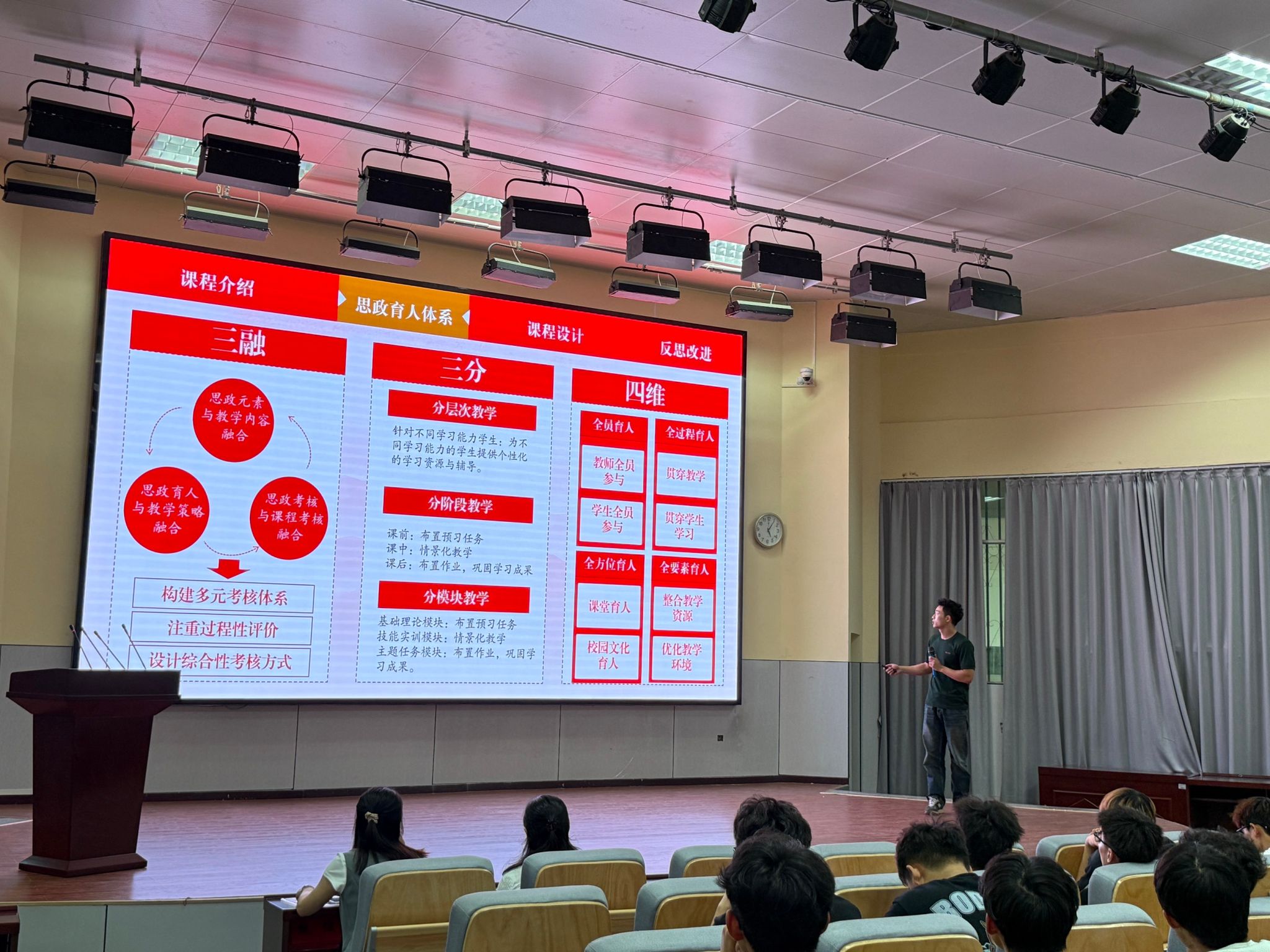穆宇娇同学则是在现场进行了体育课程思政教学片段的实战演练。他们以“长征精神”融入耐力跑、将“团队协作”类比国家建设等创新设计,直观展示了体育课堂如何成为激发爱国情怀、担当时代使命的生动舞台。演练过程激情洋溢,充分展现了新时代青年学子将个人成长自觉融入国家发展的精神风貌。